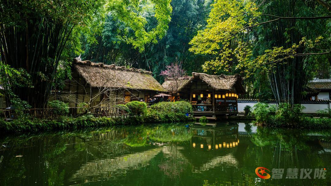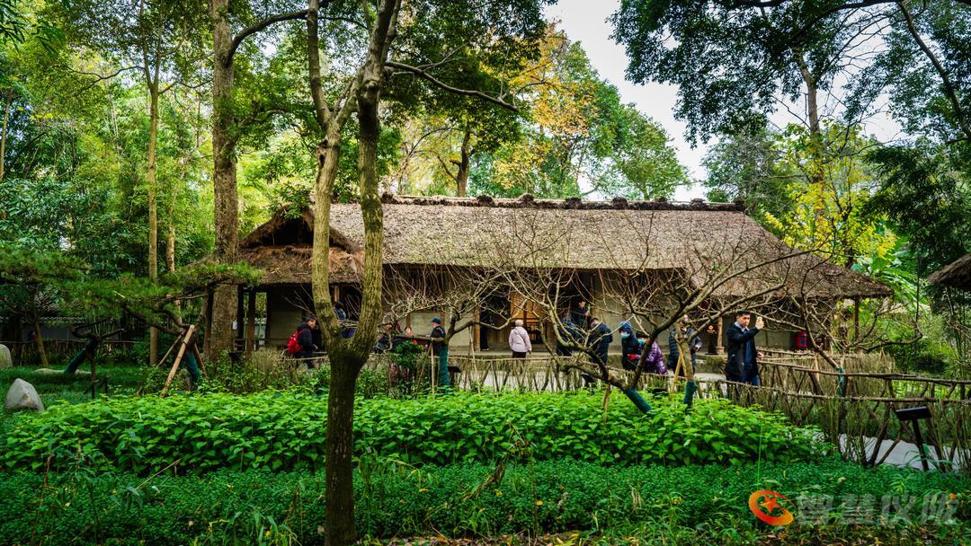 竹影摇曳,翠鸟掠过水面,留下一圈涟漪。茅屋在夕阳下拉出长长的影子,仿佛与千年的诗魂并肩而立。